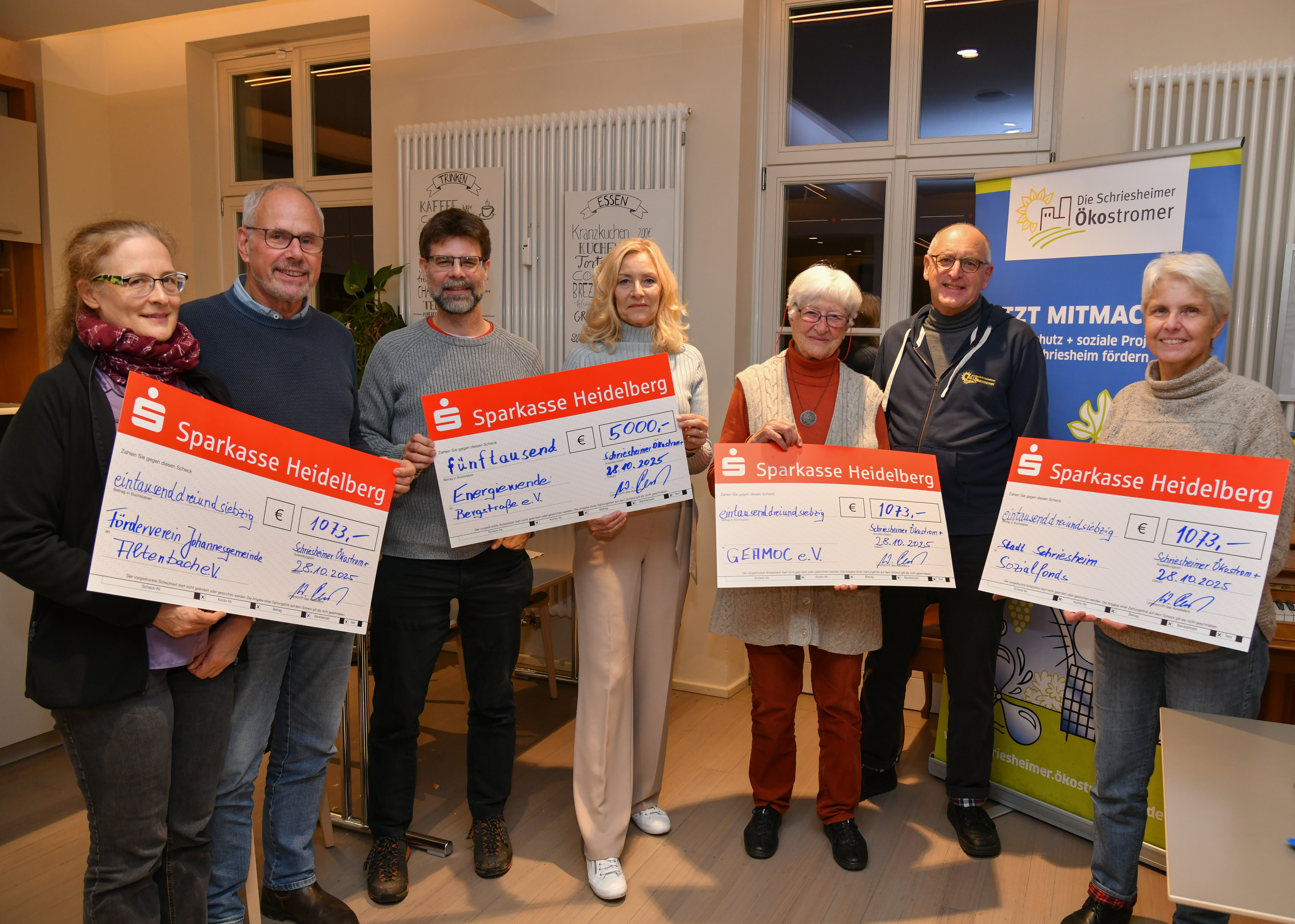 Foto: Übergabe der Fördermittel in Form von Schecks an Vertreter:innen der Projekte. Von links: Monika Rinneberg und Christian Wolf für den Förderverein Johannesgemeinde Altenbach e.V., Thomas Rinneberg und Margrit Liedloff für Energiewende Bergstraße e.V., Lilo Frenkel für GEAMOC e.V. sowie Winfried Plesch und Annette Dosch von den Schriesheimer Ökostromern.